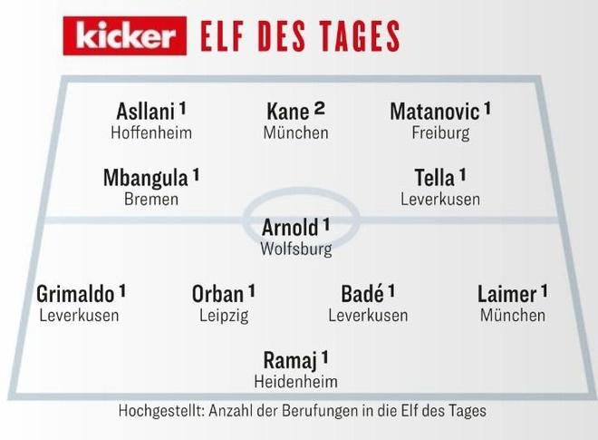 9月15日讯 德甲第3轮比赛结束,《踢球者》公布了本轮评选的德甲最佳阵。