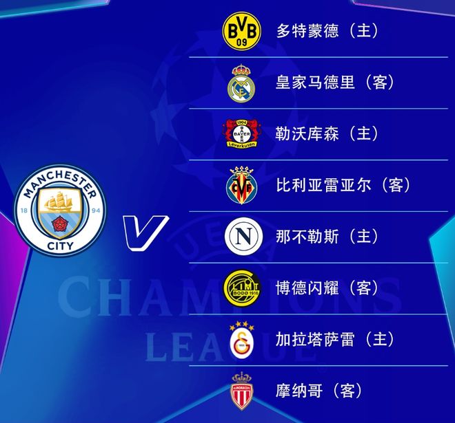 这是欧冠改制之后的第二个赛季,每支球队跟8个不同对手进行较量。经过抽签,曼城的对手包括了多特(主)、皇马(客)、勒沃库森(主)、比利亚雷亚尔(客)、那不勒斯(主)、博德闪耀(客)、加拉塔萨雷(主)、摩纳哥(客),那不勒斯的对手包括了切尔西(主)、曼城(客)、法兰克福(主)、本菲卡(客)、葡萄牙体育(主)、埃因霍温(客)、卡拉巴赫(主)、哥本哈根(客)。