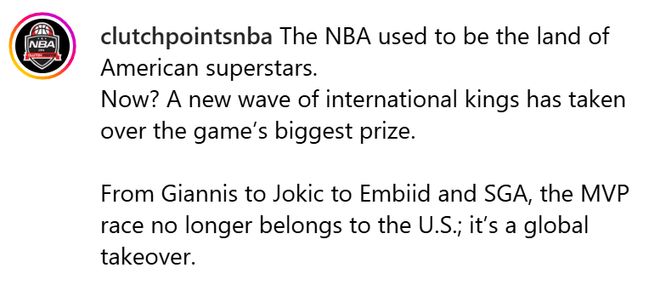美媒指出,NBA曾是美国超级巨星的专属舞台。而如今?一股国际巨星浪潮已席卷而来,掌控了这项运动的最高荣誉。从字母哥到约基奇,再到恩比德与亚历山大,MVP的角逐已不再由美国球员垄断 —— 这是一场全球性的 “接管”。