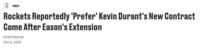 Fischer解释称,小贾巴里-史密斯此前与火箭队达成的5年1.22亿美元续约合同,“大概率也会影响伊森的续约条款”。一些薪资空间策略分析师预计,伊森预计续约合同的框架是四年,平均年薪将低于小贾的2440万美元,。此外,鉴于申京和杰伦-格林此前的续约合同中均包含球员选项,伊森的这份合约“或许也会在第四年设置球员选项”。杜兰特是火箭队今年休赛期的核心引援,但目前他的合同已进入最后一年。不过所有迹象都表明,他将按照NBA“38岁以上规则”的规定,签下一份允许范围内最高2年1.22亿美元续约合同。这支球队与这位未来名人堂成员都希望在本赛季及之后的赛季冲击总冠军。