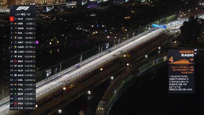 第五十九圈:换上软胎的塞恩斯冲击积分区最后的位置,汉密尔顿和安东内利争夺P5,诺里斯和维斯塔潘继续P2争夺。