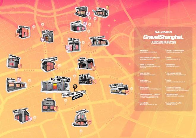 SALOMON GravelShanghai 无固定路线挑战赛是萨洛蒙的全球首赛。来自亚欧美十几个国家的500名跑者以上海核心商圈为起点,完成一场穿行魔都市区、无固定路线的积分打卡挑战赛。他们在赛前半个小时才会被告知自己的首个打卡位置,除了按照要求需要完成至少6个点的打卡之外,所有的路线规划皆由跑者掌控。