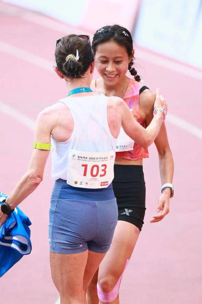 早晨7点的杭州,气温15度,相较更寒冷的西安,朱卿明显感觉到今天的肌肉跑起来完全不一样——有知觉,腿也没有打飘。前5公里,朱卿习惯先看看感觉,也按照自己计划中前半程76分到77分中的目标去跑。因为知道后半程有爬升不好跑,所以她想着那就争取跑个235左右。但是没想到跑了大概3-4公里时,一位澳大利亚的跑者上来了,一直位于朱卿之前4-500米,而这也反而给朱卿带来了动力,“按照她PB成绩来的话,她的成绩比我好太多了。”在此前,还有三位水平更高的外籍黑人选手,从出发前就已经没了身影。朱卿想着那就跟着这位白人选手,争取别被甩太远,可能后面还有点机会。就在这样“一直往前看”的念头中,朱卿跑完前半程用了差不多75分钟。